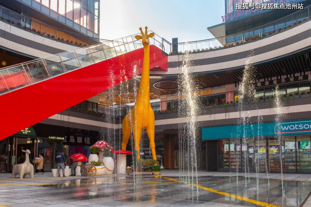 音乐广场上,12m高的巨型长颈鹿形象成为热门打卡点,让消费者感受阳光、动物、花草、流水的舒适环境。