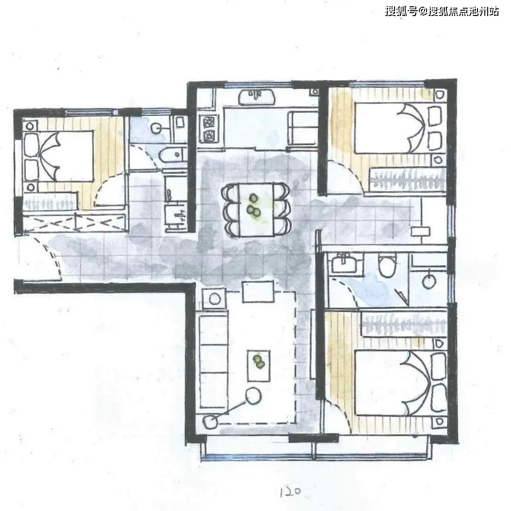 约120平米三居,南北通透3.5居室。除了三个卧室,还有一个多功能空间,可以作为书房等用途。双明卫设计,主卧套房,餐客厨一体化,这个户型比较适合刚改群体。
