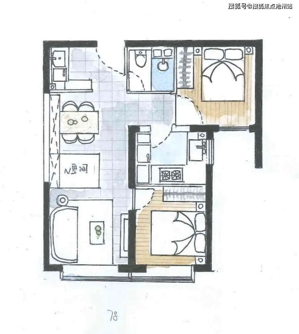 约78平米(有可能是80平)两居,纯南向和纯东向都有。纯南户型分布在8#9#10#三栋楼,纯东户型分布在1#5#。这个户型格局比较方正,总价不高,两个卧室比一居更实用,适合刚需上车。