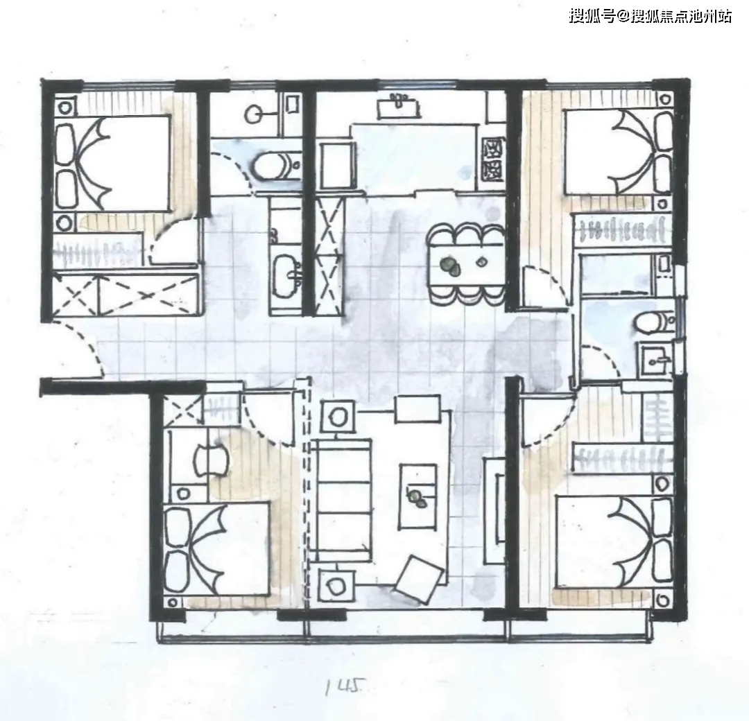约145平米四居,是绿城沁园较大的一个户型。南北通透,三面宽朝南,四叶草布局,四个卧室互不干扰,私密性很好。这个户型主要在3#,位于小区的最北侧,具有小区较大的楼间距和较佳的观景视野。