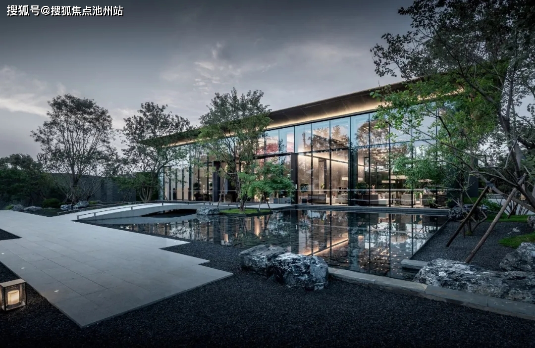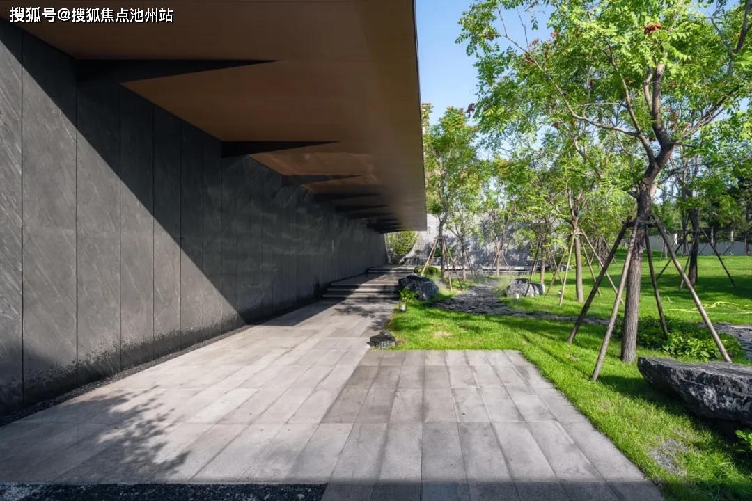 继承东方园林步移景异的特点,入口第二景进行了开敞的迎宾入口的转换对比,两折之后豁然开朗,自然禅意的林侧,轻质的连廊与远处高墙流水山墙若隐若现,形成一幅静谧的山水画卷。