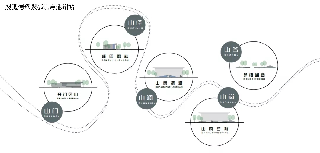 山径山溪山居,充分利用了原状空间的竖向高差,从进入示范区后营造了一场山间居游,由低到高,步步抬升,使观者充分沉浸于自然。