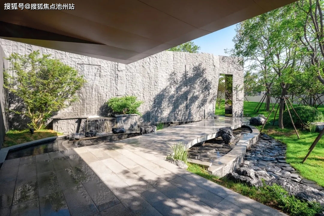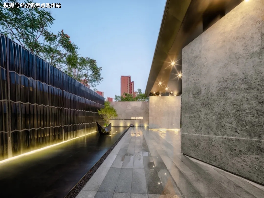 迎宾排名前列印象的影壁,通过深色石材的东方符号式切割与矩阵式重复切题西山,下置舟形雅韵雕塑营造东方山水意境。