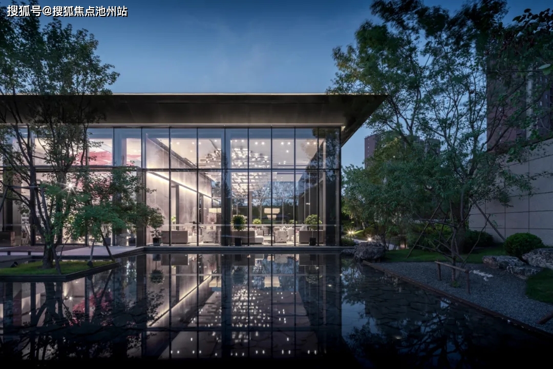 日暮,水面与天空将高乔、山石、建筑通过连成一体,灯光凸显出售楼处的古典文化韵味,红色盘龙若隐若现,引人期待;