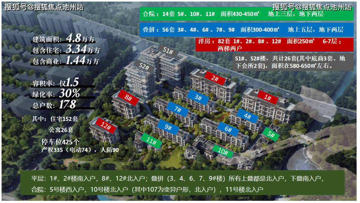 小区规划:178户 :人车分流,车位地下425个,住宅1:1.5,整体1:2