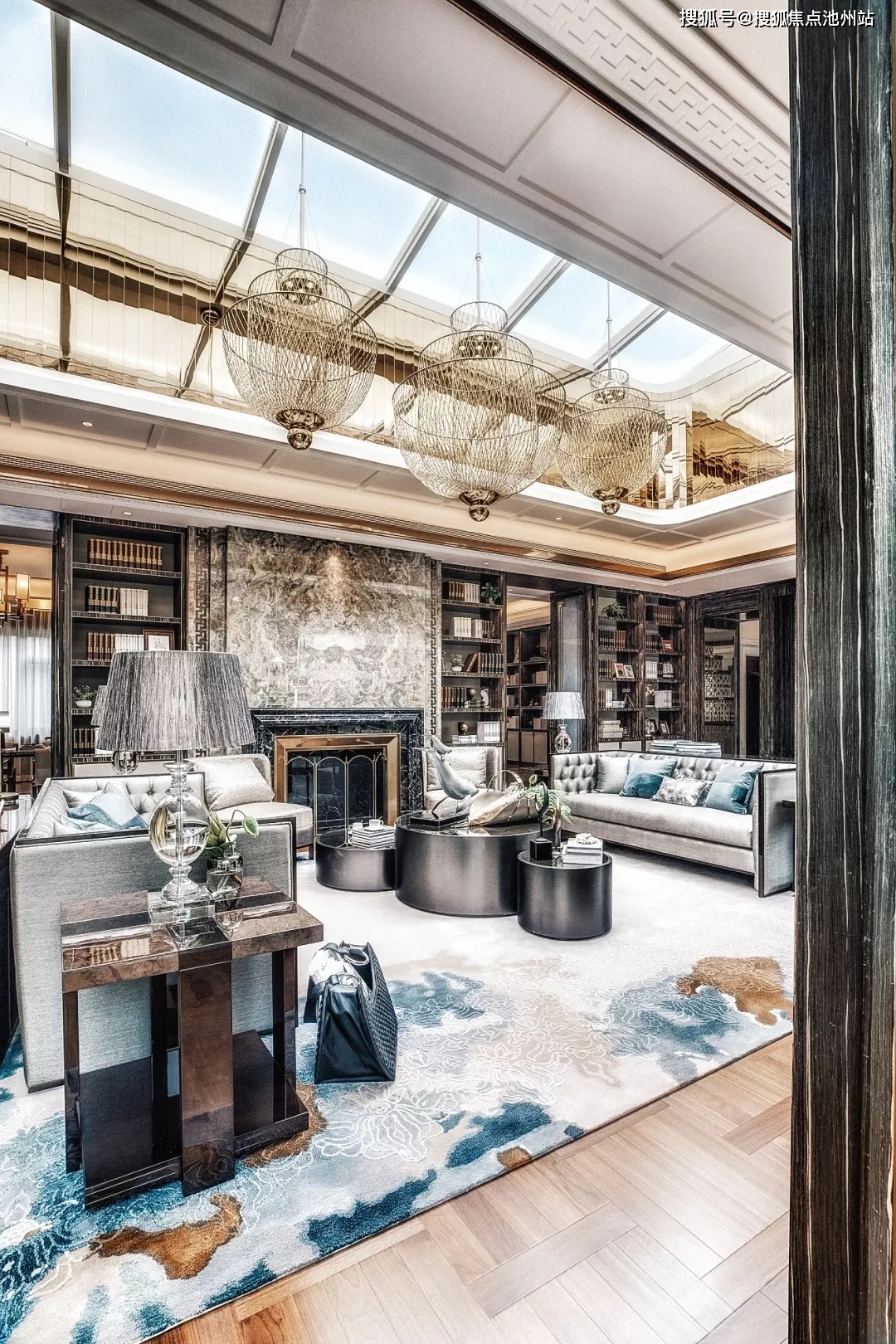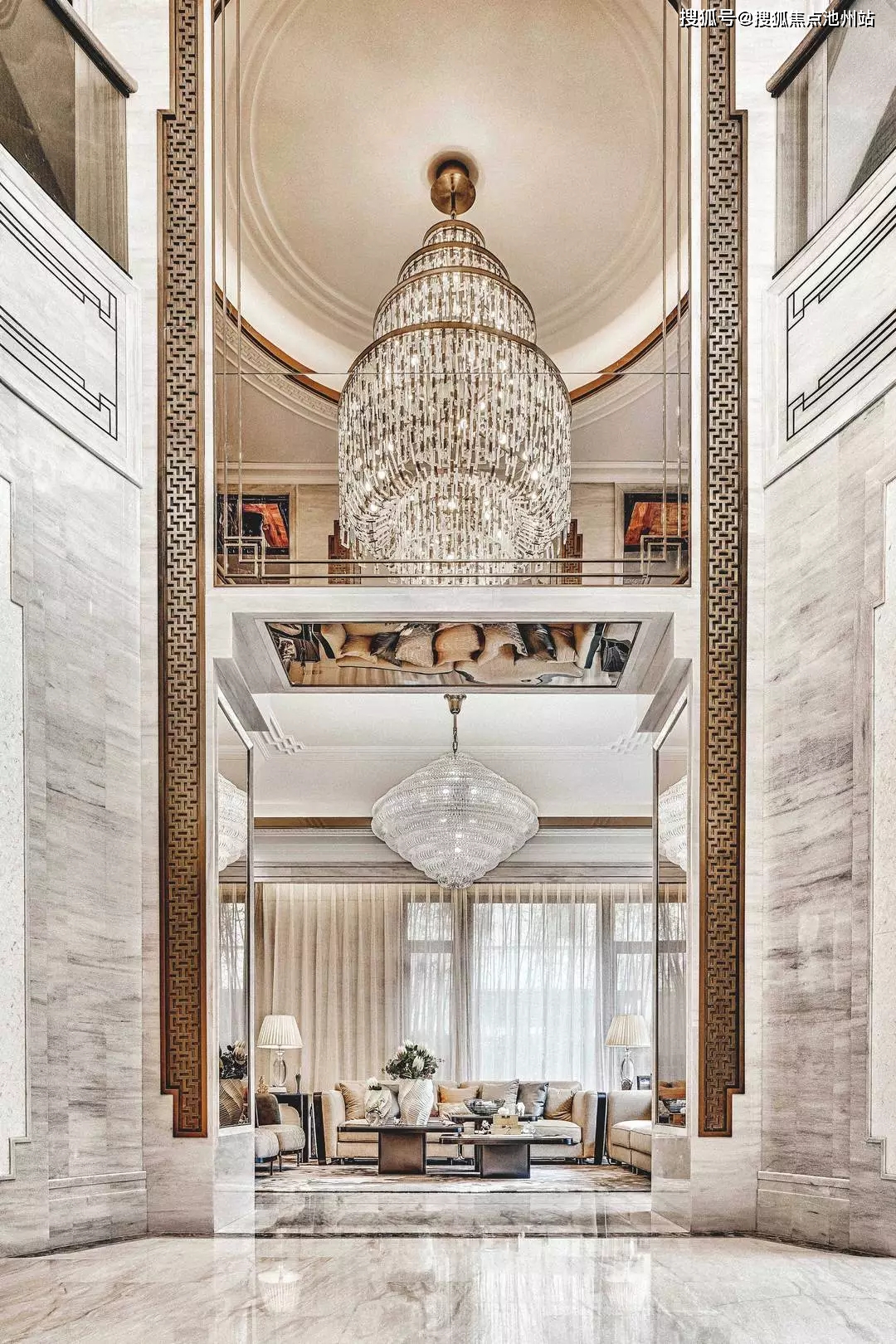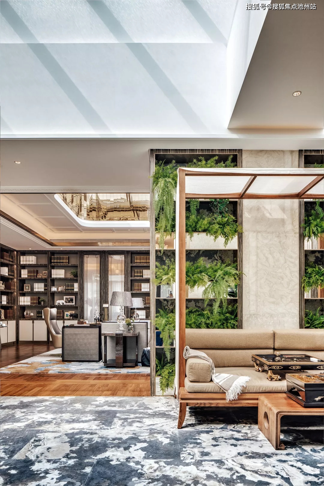 材质运用上,在墙面、地面、垭口处大面积选用纹理优美、光泽柔和的欧亚木纹石材,这些反映山纹、水纹、地纹的天然材质的出现,模拟了船行之感——山影后移和水纹波动都为空间营造出“忽闻海上有仙山,山在虚无飘渺间”的诗画情境。
