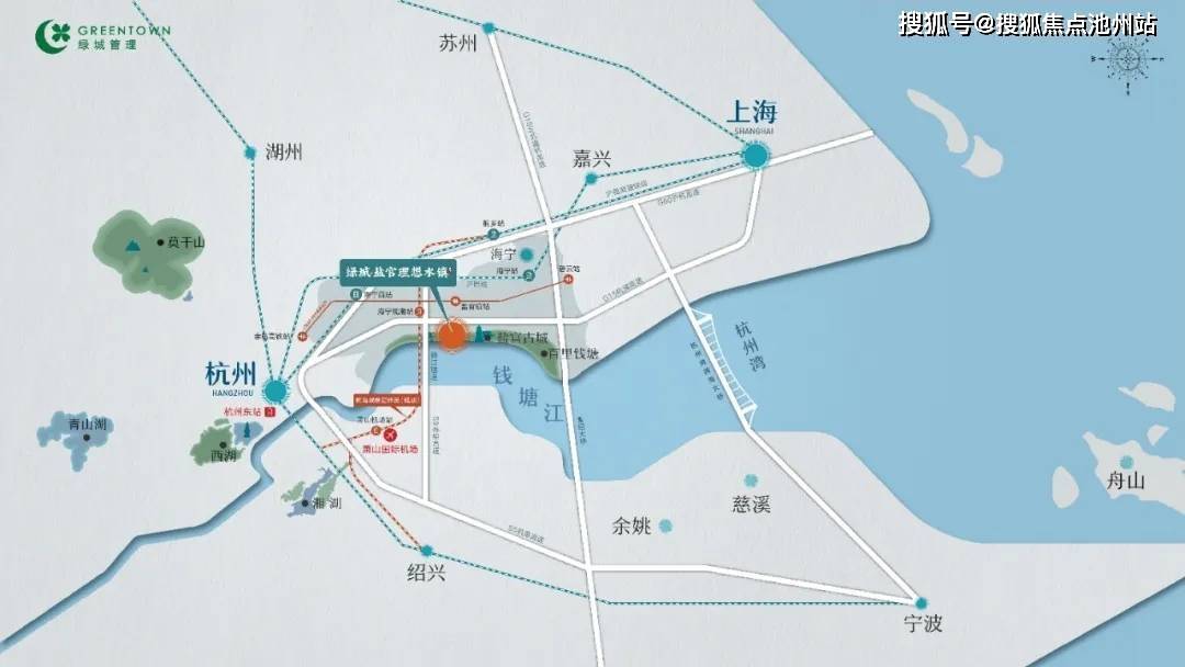 紧邻临平副城和下沙,钱塘江北岸与大江东隔江相望,浙江省北部,地处长三角的核心位置,半小时生活圈辐射杭州城东、城北、大江东、嘉兴、湖州等地;1-1.5小时可到达上海、宁波等地。围绕盐官交通枢纽有三条高速、一条轻轨,沪杭高速(5KM)杭浦高速(1.5KM)直达沪杭;苏绍高速(2.6KM)直达绍兴;