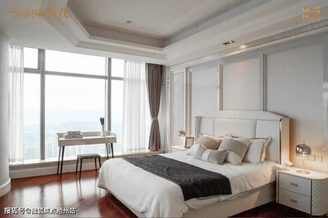 白色、米色、灰色的极简色彩打造轻盈而富有质感的空间,立面装饰线条简约,彰显美式都会的摩登气质。窗墙高比例,将窗外美景向室内无限延伸,悦鉴城市的溢彩流光。