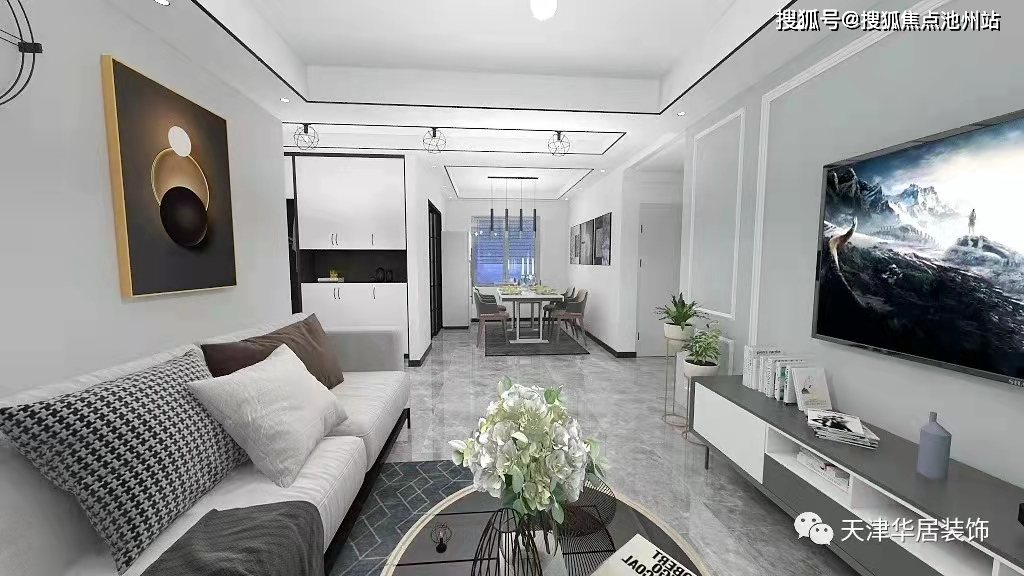 客厅与餐厅在一条轴线上,形成情景餐客空间,“统摄”全屋,消除了走道,室内可利用空间达到较大化。
