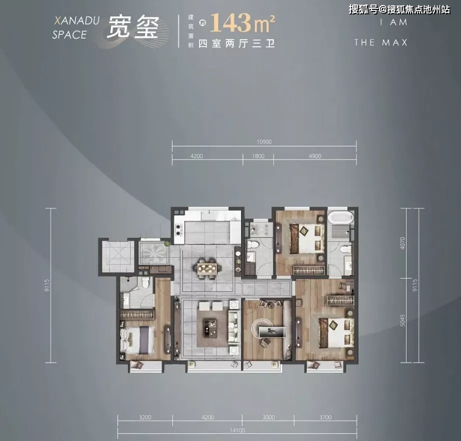 143㎡为四室两厅三卫,南向四面宽,14.1m的超大南向采光面,在整个区域来说,这个尺度都是少见的。南向卧室有三个,超大的主卧套是高改户型的必备,次卧同样拥有宽敞的洗浴空间。