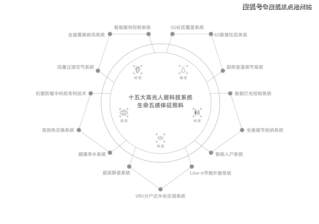 鑫苑·盛世天玺智造15重高光人居科技系统,如5G社区覆盖系统、6S智慧社区体系、四重过滤空气系统、健康净水系统等。
