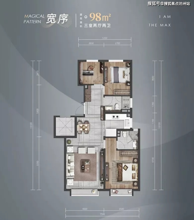98㎡为三室两厅两卫,是此前北京限竞房主流89㎡户型的升级版本。南向面宽7.5m,主卧套设计,北侧两间卧室中间为非承重墙,可满足不同家庭周期的需要。