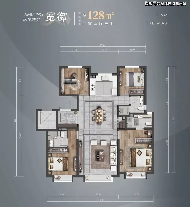 128㎡为四室两厅三卫,户型方正,南北通透。门口设置玄关,采用经典的南向三面宽设计,整体采光面达11m。餐厨客一体,厨房采用U型设计,