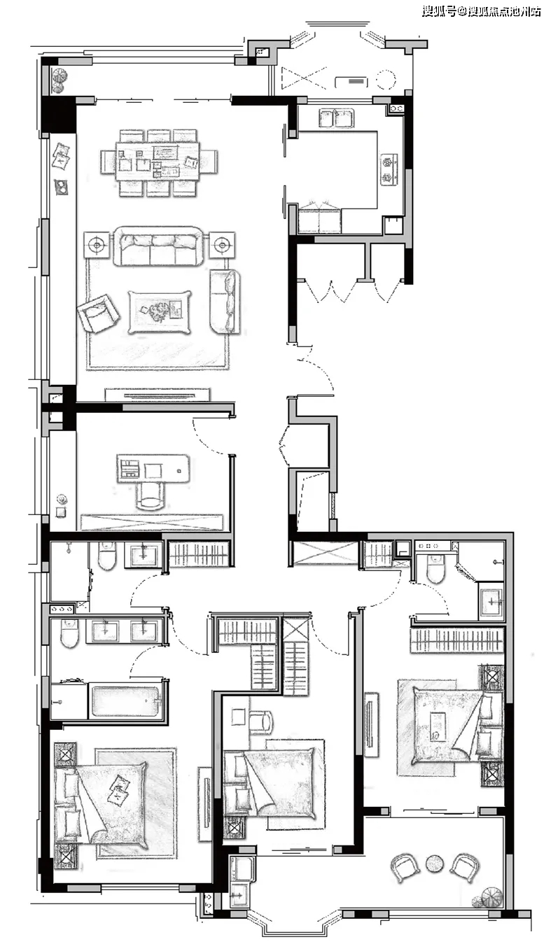 更值得一提的是,整个户型,北面餐客厅与朝南三卧,通过书房和过道分隔,做到了较为彻底的动静分离。