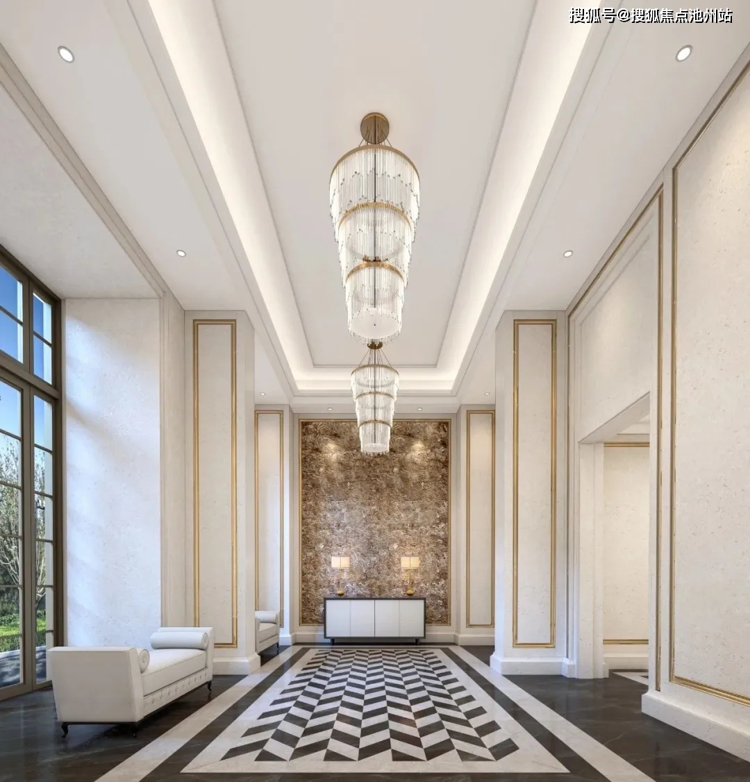 约5.1米挑空,净高超4米,搭配层次丰富的吊顶和两个大型水晶吊灯,营造出优雅华贵的氛围。
