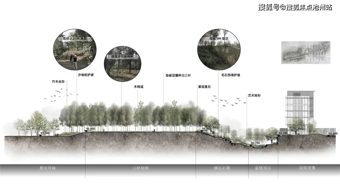 阳光城北京 · 溪山悦项目基于现场勘探展开设计,以轻介入的方式尽可能保留场地原有的自然环境,路径的开口、道路的走向、水景的位置、植物的点位均依据现场条件而定。
