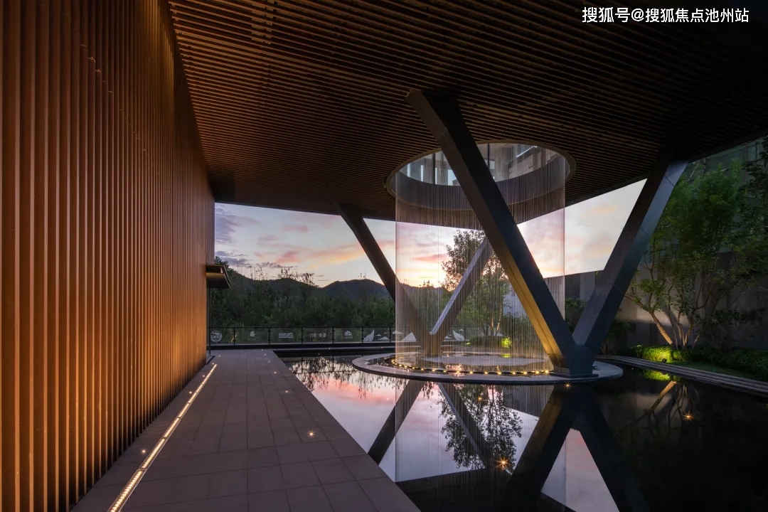 夜幕降临,伴随着落日余晖,流瀑从空中倾泻而下,水中自然之景掩映成趣,虚实之间流露着温馨与舒适。