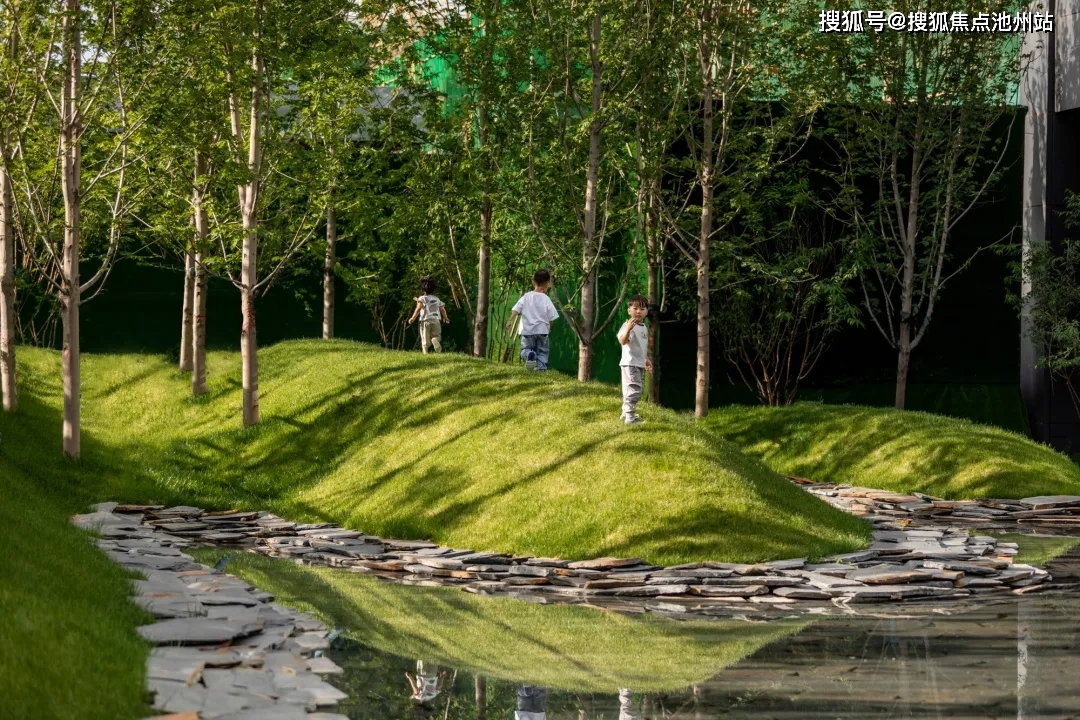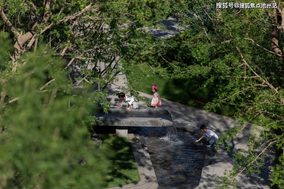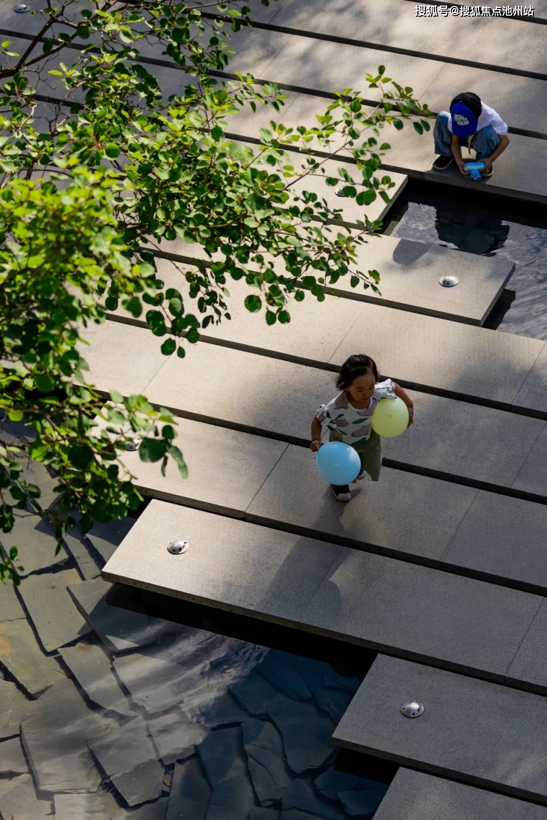 孩子们在散落的汀步上游玩嬉闹,轻轻拨弄着水面,乐此不疲;回荡的欢声笑语,极具生机与活力。