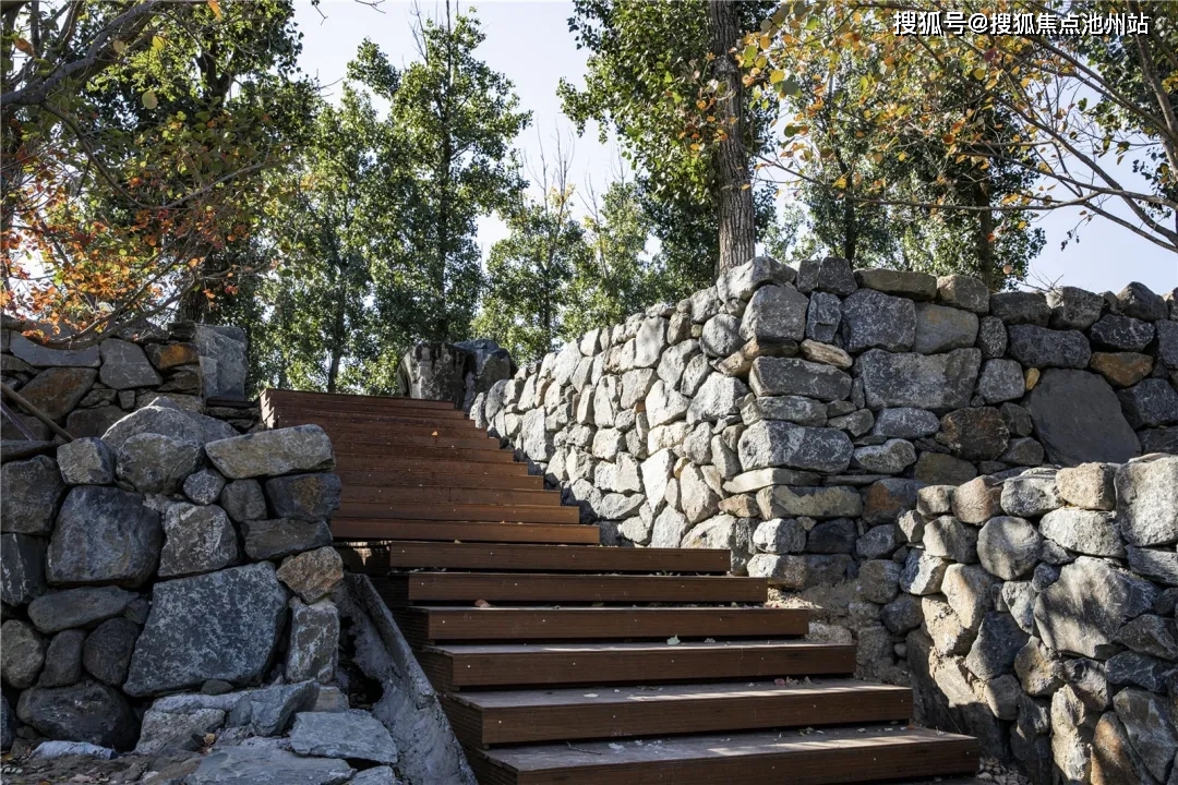 现场有一9m的山坡陡坎,通过对现场的地形勘探,设计在保留现状大树的基础上设计合适的路径开口及道路走向。利用毛石挡墙进行固土护坡,并设计蜿蜒转折的竹木台阶营造山林石趣的自然意境。