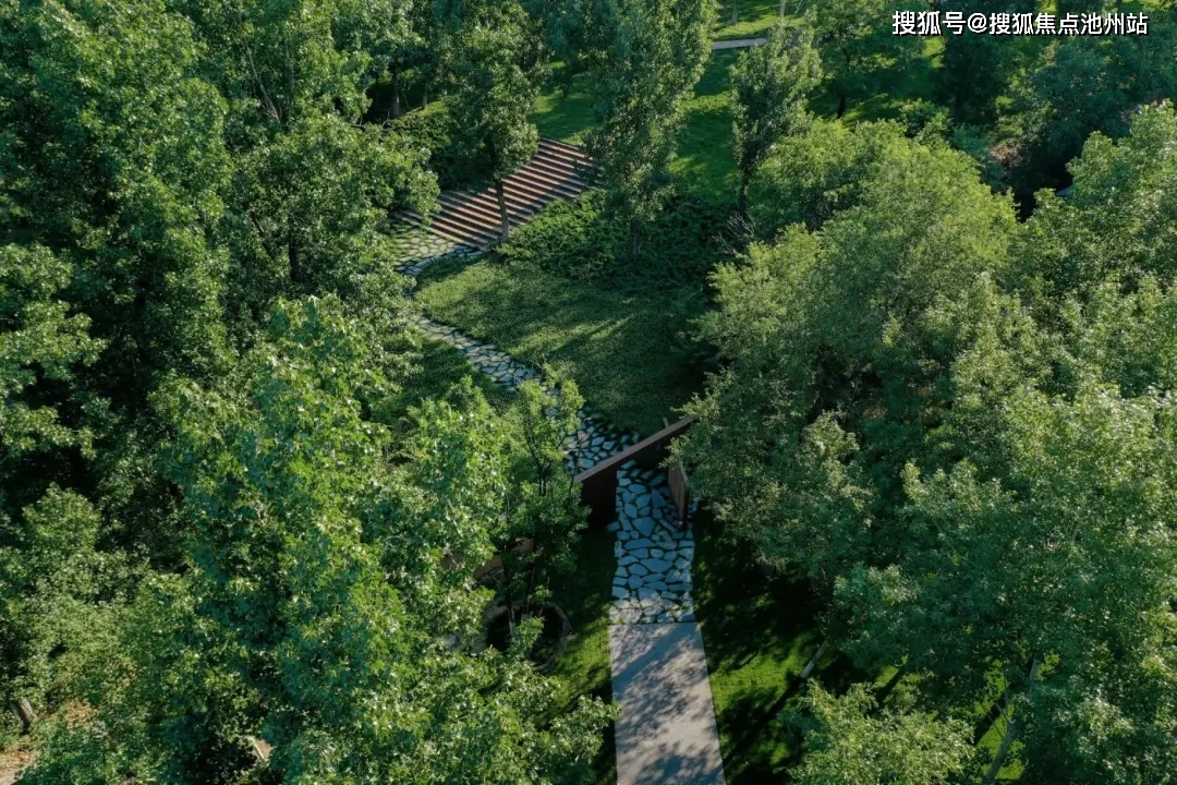 原有的一片杨树林被保留,设计用低影响的方式对地被层进行处理,打造干净完整的绿色基底。一条轻盈的木栈道漂浮其中,曲径通幽、避世又治愈,呈现难得的隐秘山林风光。