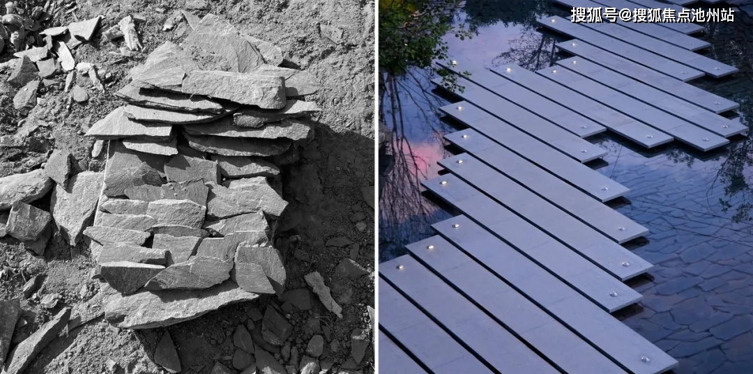 平静的水面,倒映着山光树影,散落在溪流上的汀步纵横成趣。自然与人工相辅相成,清幽而素简。
