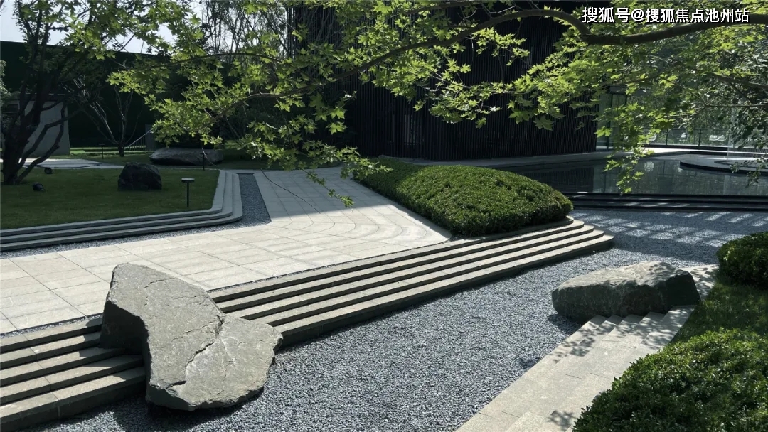 薄薄的几层叠级种植池,模拟溪流的轮廓相互交错,延续着溪谷的脉络。石阶的设计推敲,削弱种植池的体量感,犹如漂浮在地面上一般灵动而又延展。