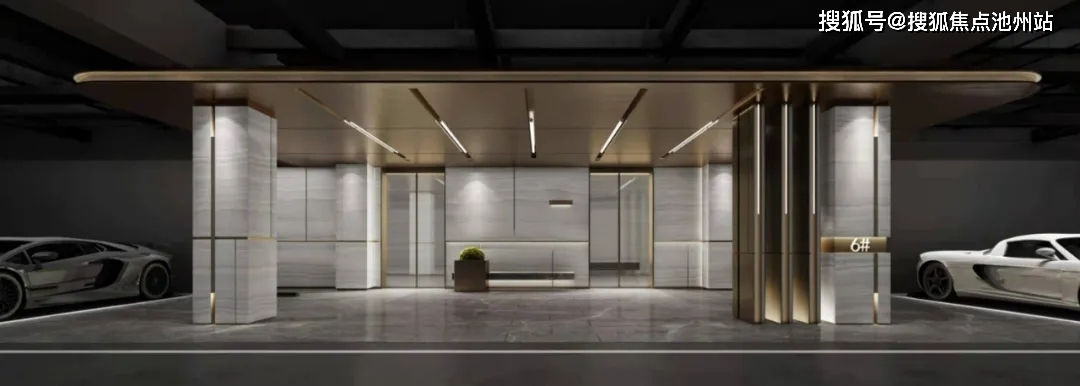 B1地下车行道设置迎宾空间,内嵌式灯光的入口车库,岩板装饰面,天花造型,设计升级的同时,让业主拥有先进豪宅归家仪式。