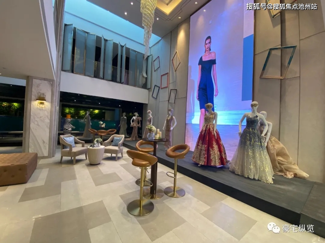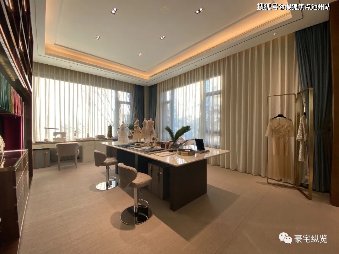 44平米的橱窗式模特展示区,约80平米的私人高级时装定制工作室,地下二层模拟大师郭培秀场场景,7.8m挑高的空间有水幕澎湃而下,时尚舞台侧面搭配近百平无边泳池。