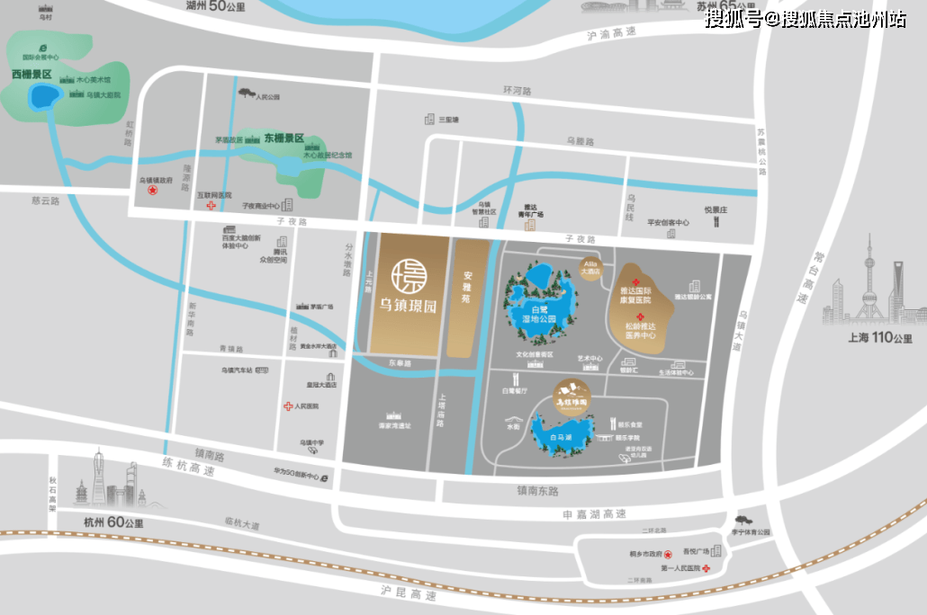 首先,作为沪苏杭交汇地带,在交通便捷程度上,35分钟到达桐乡高铁站,1个半小时均可抵达杭州萧山机场、上海虹桥机场,再加10分钟即可到达上海浦东国际机场,项目旁8分钟车程的乌镇客运站均可抵达以上地点,而且项目交付后还将配备班车供业主出行。