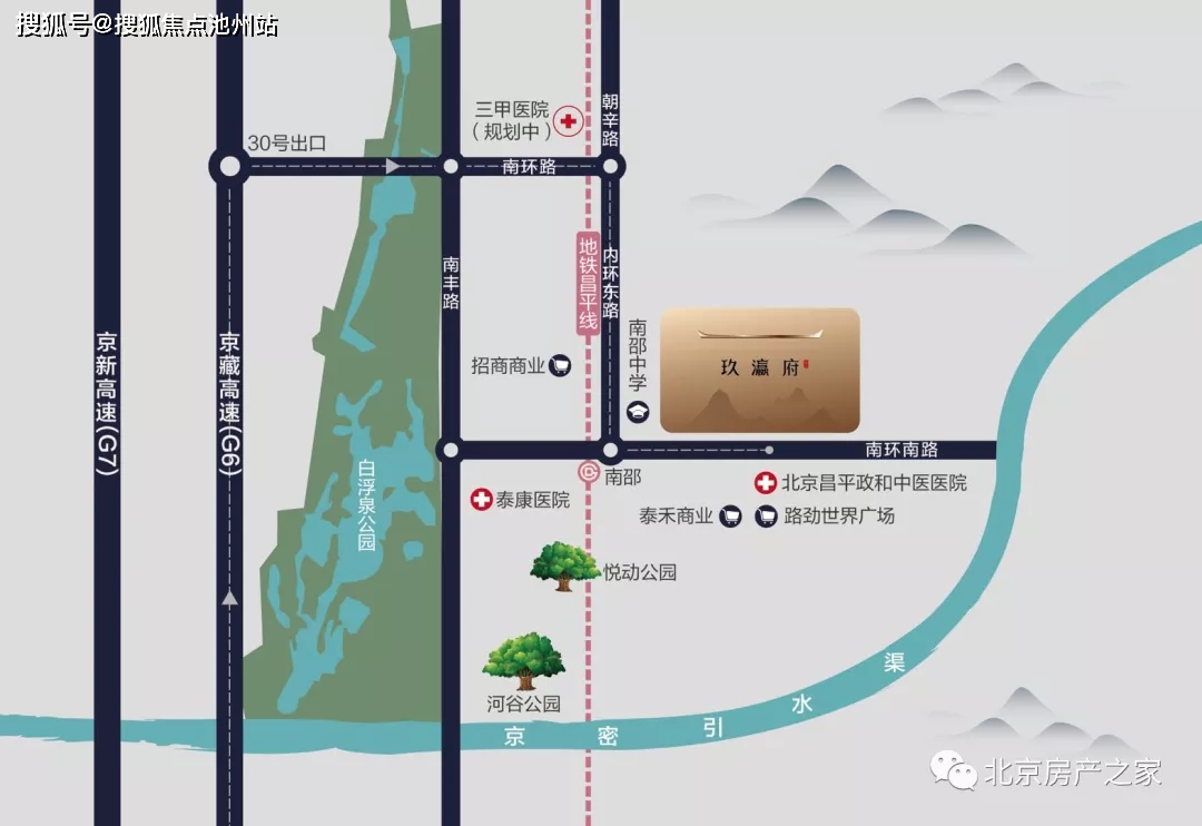 项目位于昌平区南邵镇南金路7号院,隶属昌平新城东区,背靠九里山麓,面朝京密引水渠,源承紫禁瀛台,一脉故宫龙脉轴线正北,距离地铁南邵站仅2公里,毗邻京藏、六环路,繁华与静谧自如切换。区域内规划约33平米高端商业及12年制清华附中昌平学校。项目坐拥8.7万平米私属山体公园,整体布局在16米台地高差之上,层层递进,与三园四巷十八坊山水园境浑然一体,营造出16万平米新中式臻罕0.81低密浅山纯墅景观群。产品涵盖合院、叠墅、联排三大类型产品,同时联袂大师邱德光匠著空间,汇集全球品牌、采用智能家居系统,从每一个细节礼遇居者。