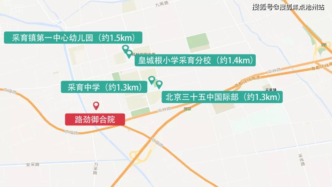 公办学校:采育镇排名前列中心幼儿园(约1.5km)、黄城根小学采育校区(约1.4km)、北京三十五中国际部(约1.3km),采育中学(约1.3km)等,可实现幼儿园到高中全程教育。