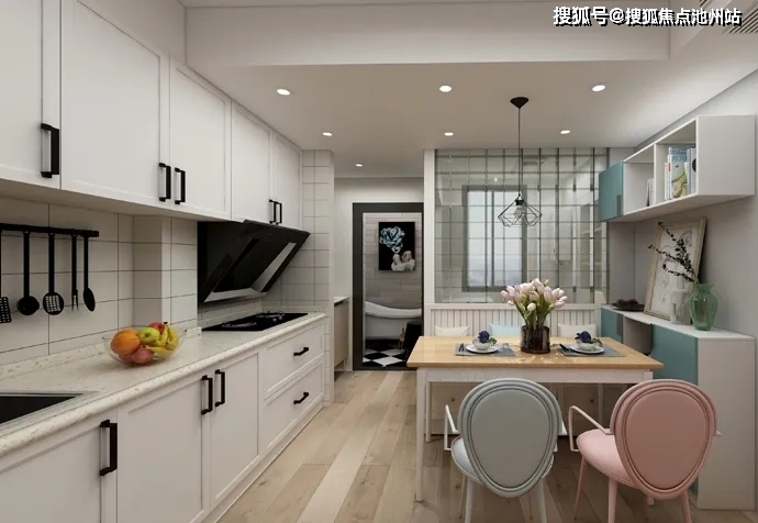 以粉色、浅墨绿色、灰蓝色等色系相组合,呈现温馨舒适的少女卧室,业主不经常做饭,所以将厨房做成开放式的,从而在视觉上扩大空间,浴室则是选用浅灰色装扮,不仅增加了视觉上的开阔,还很大气。