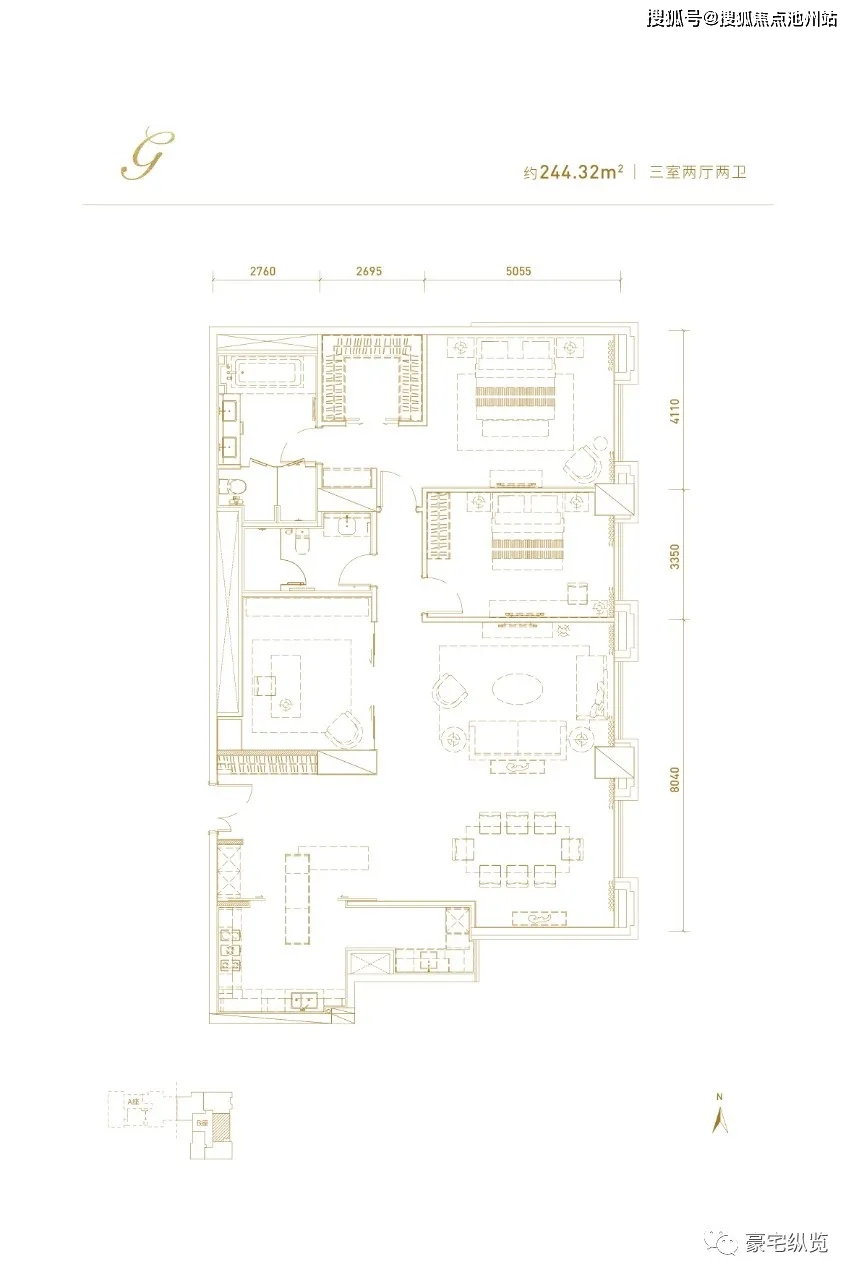 北向看金宝街,325平三居室,南向2个卧室,居住舒适度很高