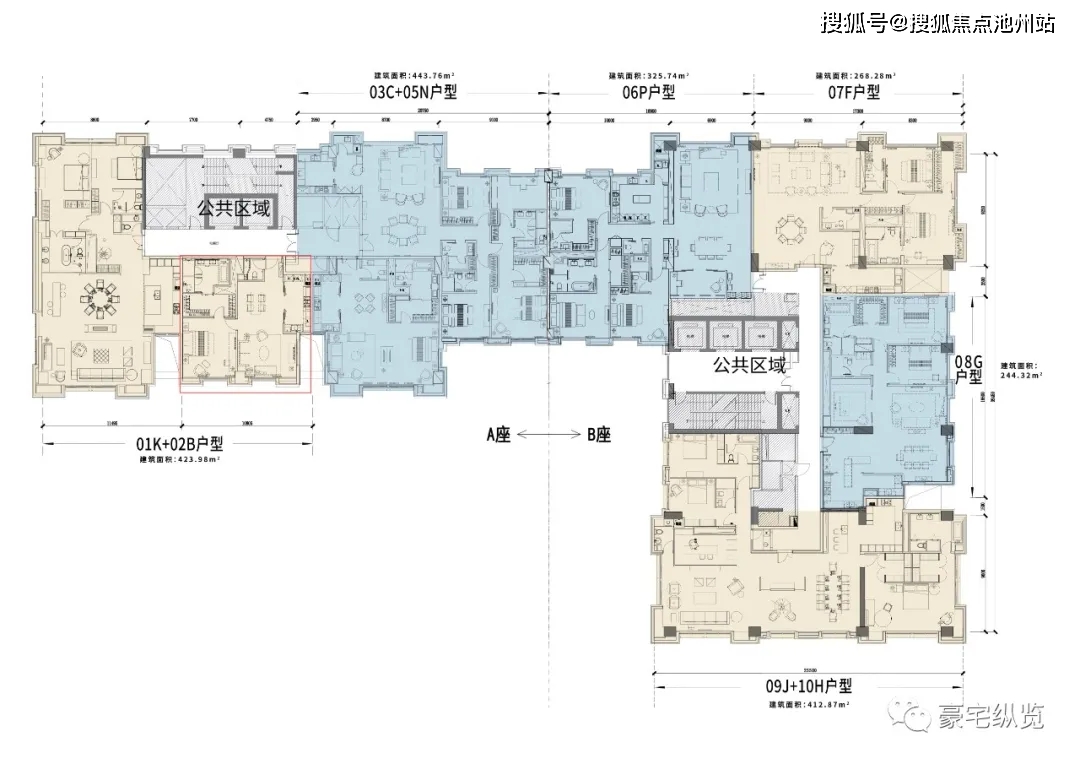 B座户型的话是单套面积较大的是325平米的大于325平米的都是两个房本儿,比如说是423平米的和443平米的,这两个户型都是两个房本。