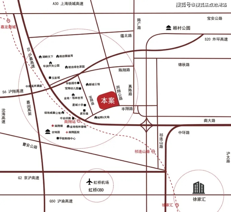 项目地址位于嘉定区南翔古镇,地处嘉定、普陀、宝山三区交界处,东临浏翔公路,南靠丰翔路,紧邻地铁11号线,旁依沪嘉、沪翔高速,是近年来各界关注度较高的商业地产项目之一。