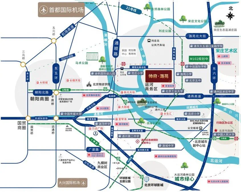 3再来看看配套,周边配套还是可以的,只是有很多在规划或者建设中。先看交通,道路交通南有通燕高速,东侧有东六环路,西侧通顺路,北侧是朝阳北路,距离首都机场25分钟车程,距离国贸30分钟;地铁方面,目前周边距离最近的地铁是6号线通州北关站,直线距离大约2公里。