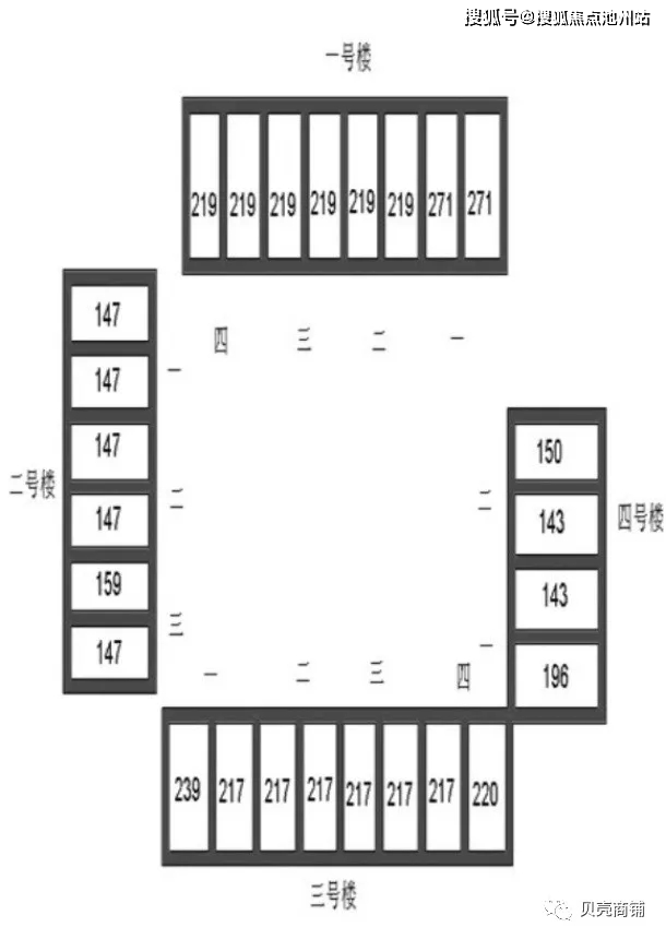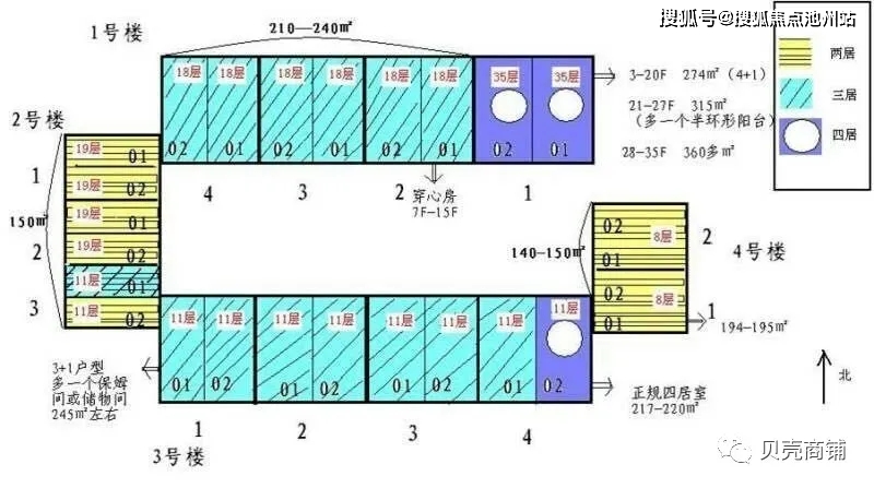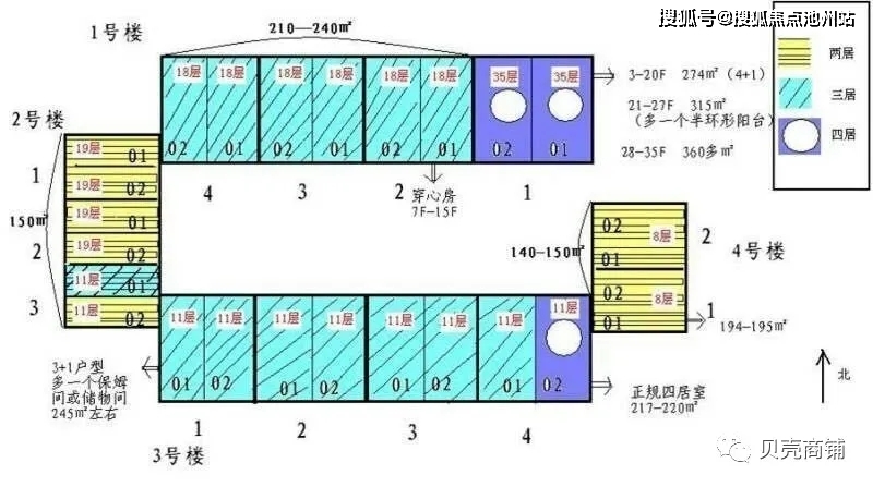 一,三号楼为南北向三居,217-219平米,四居,271平米,二,四号楼为东西向两居,143-196平米,两居,其中一,三号楼为两梯两户,二号楼,两梯两户,四号楼,一梯两户。
