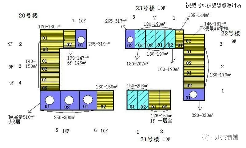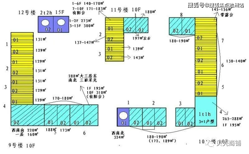 12号楼的两梯两户,除了10号楼4单元一梯一户,其他的都是一梯两户。9,10号楼东西向都是两居室,南北向除10号楼一单元和四单元外,其他的都是三居,12号楼是四居。两居129-145平米,三居,172-197平米,四居288-324平米。