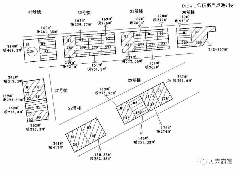 除了27号楼一梯一户,其他楼栋都是两梯两户,两居146-169平米,三居175-239平米,四居252-284平米。