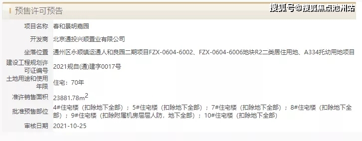 10月25日,通州纯商品房石榴春和景明(春和景明嘉园)获得预售许可预告,并于26日拿到预售证,准许销售面积23881.78㎡,具体信息如下: