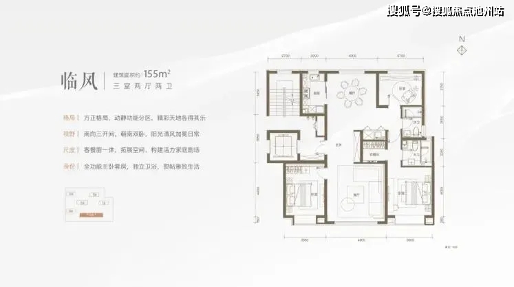 建面约155户m²,格局方正,南北通透,南向三面宽设计,南向面宽达12.05米,空间开阔大气。