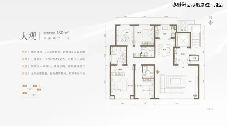建面约180 m²户型是主力,四室二厅三卫设计了二豪华套房的配置,客厅面宽更是达到市场同面积户型的较大——7.2米,整个南向达到14.4米的总面宽,空间尺度超同类产品。