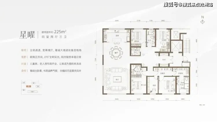 建面约225m²户型是楼王户型,四室三厅三卫设计,仅有20套,不仅五面宽朝南,且享有270度三面采光的大边厅设计,格局排布充满舒适度和仪式感。