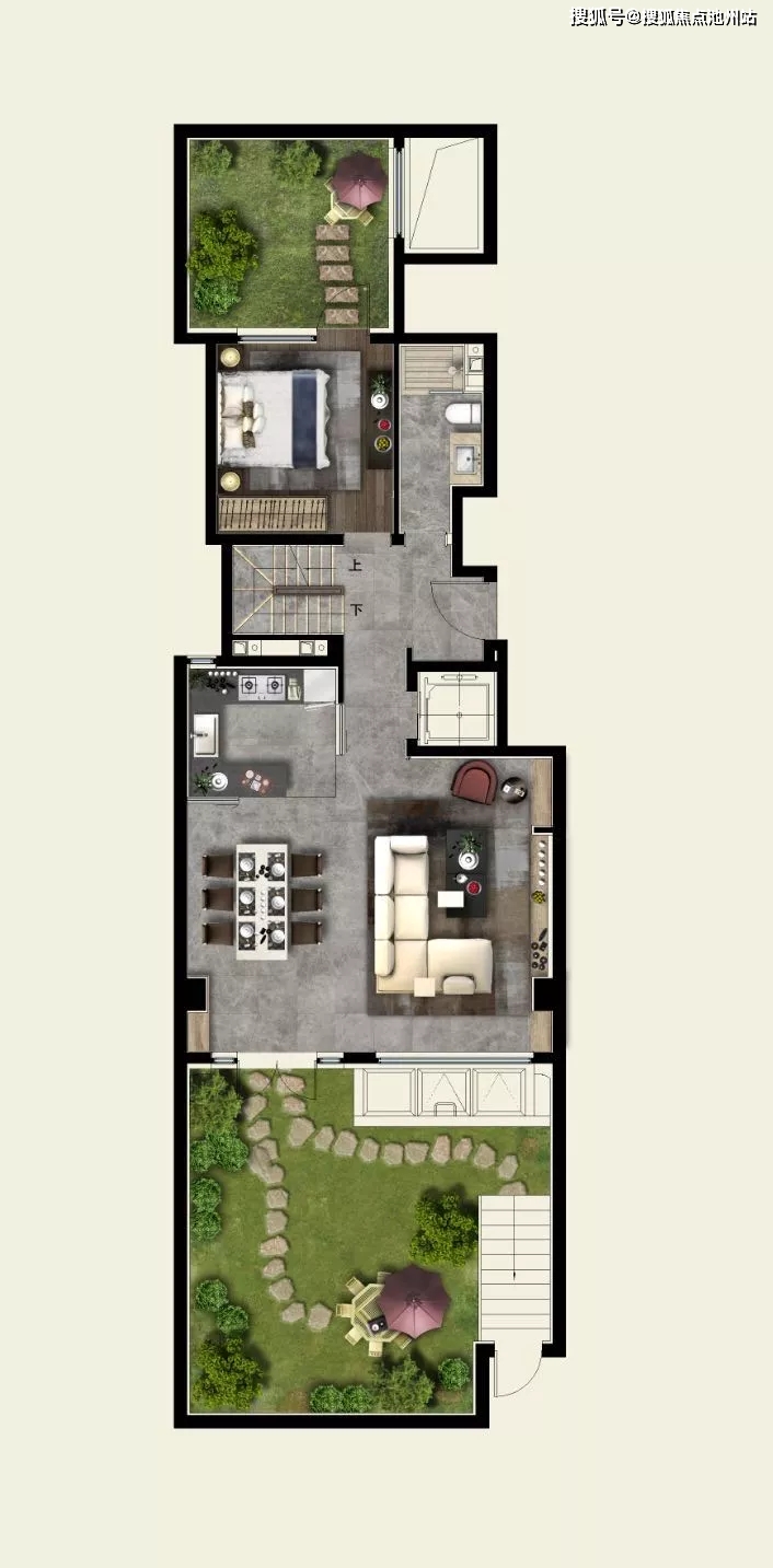 叠拼户型 :下叠(1+-1+-2 南北双花园 )面积330平 总价1700万起(一层住宅、两层仓储