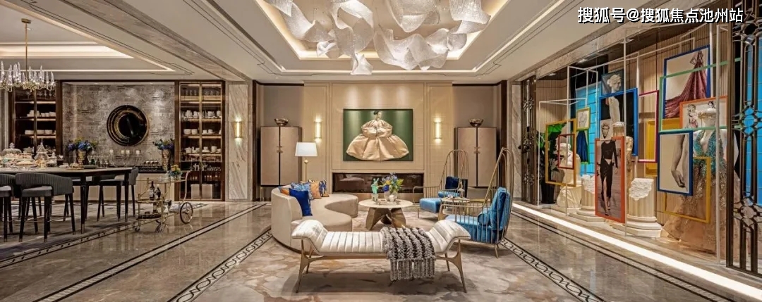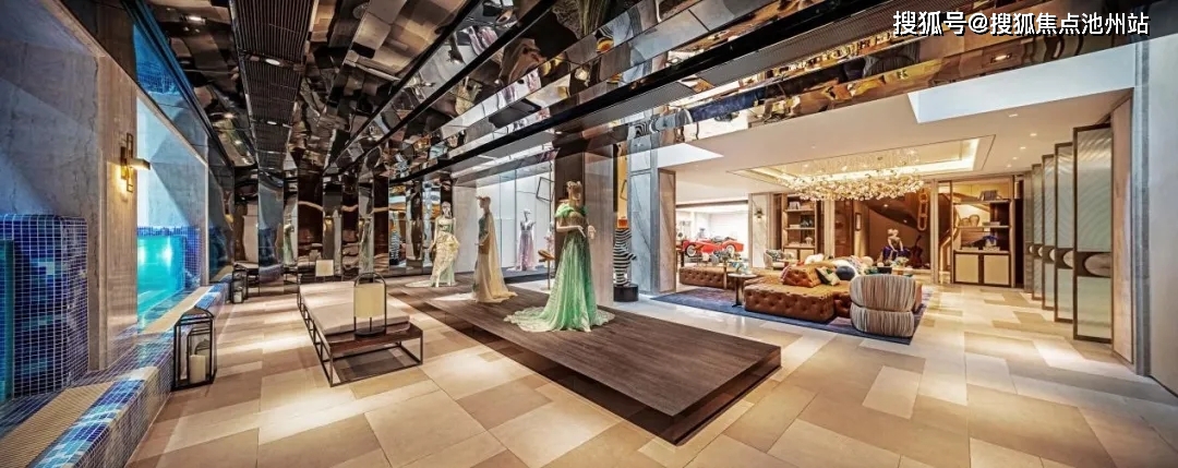 44平米的橱窗式模特展示区,约80平米的私人高级时装定制工作室,地下二层模拟大师郭培秀场场景,7.8m挑高的空间有水幕澎湃而下,时尚舞台侧面搭配近百平无边泳池。