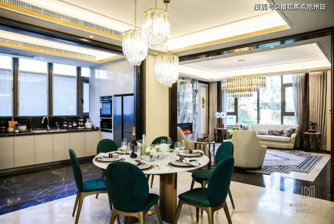 12.5平U型的大厨房连接近23.5平餐厅,整个一层都在彰示大尺度带来的舒适感。
