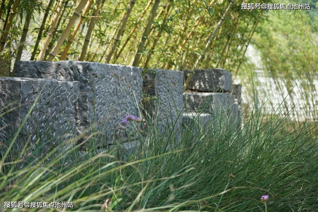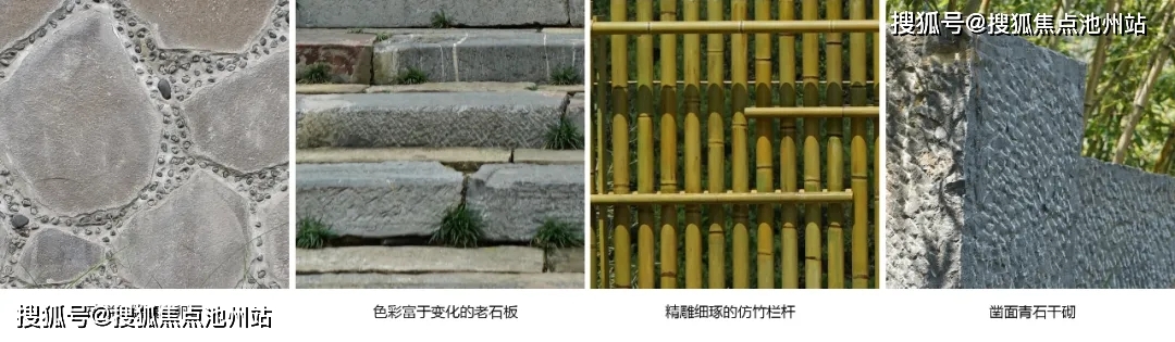 在这个项目的景观材料及植物选择上,易兰设计团队较大程度上体现了安吉当地特有的风土人情:如入口处的特色矮墙使用特殊的碎拼勾缝镶嵌卵石工艺;铺就道路的老石板都是从附近村庄收集而来,曾作为老宅院的石墙使用,上面甚至刻有某一户村民的姓名。老石板年代久远,色彩富于变化,呈现出了岁月积淀之美;沿途使用的竹扶手灵感来自漫山遍野的竹林,为了兼顾质感与耐久性,将竹材换为钢管,经当地匠人手绘成竹竿;毛石墙选用当地毛石,经凿面处理,并聘请当地老师傅以干砌的传统工艺重现质朴之美。