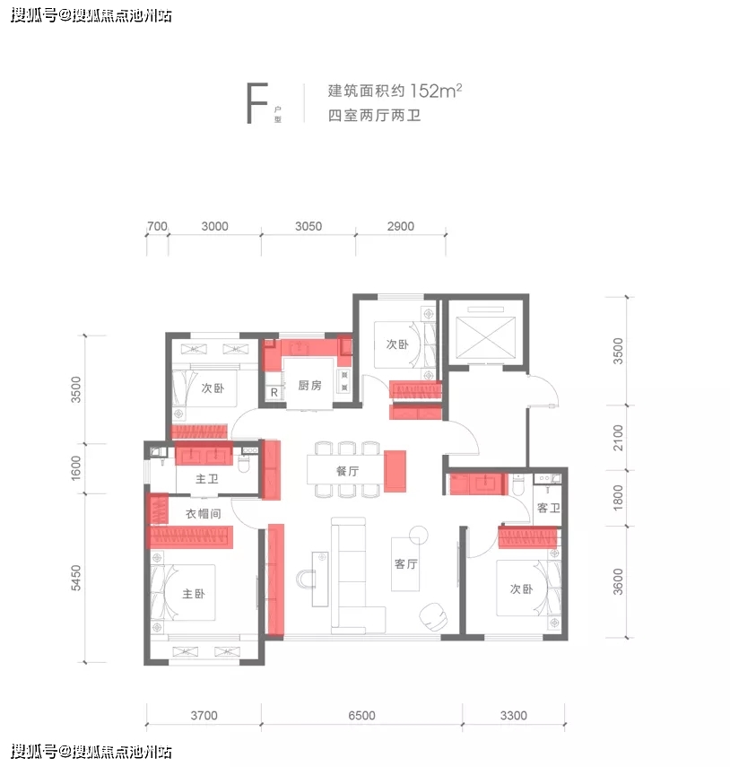 主力户型建面约152平可圈可点之处也很多。总面宽达约13.5米,客厅面宽约6.5米。