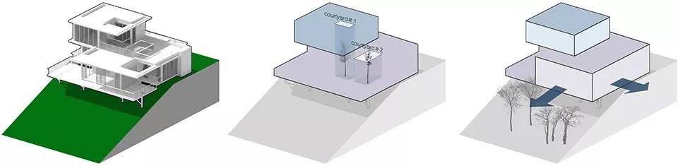 除此之外社交空间的增大使人获得了精神层面上的满足, 当你站在那里铺面而来的是山下的景色,让人有足够余地与自我相处。倾斜的基地与山脉的走向相垂直,周围是一片翠绿的景色,覆盖在无尽的蓝天之下,阳光明媚,草木在微风地吹拂下微微颤动。建筑师试图将大自然的福祉同日常生活联系起来,通过将它们植入人的灵魂,来放大生活的喜悦。