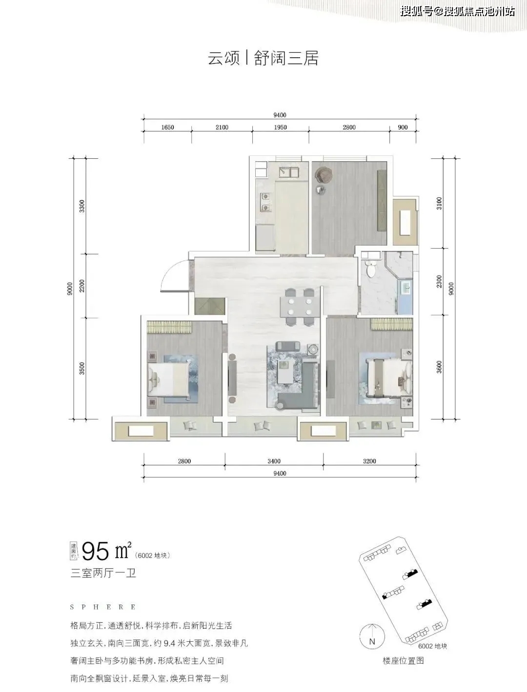 95㎡三室:南向三面宽约9.4米,面宽进深比>1,明厨明卫,LDK中轴动线设计,居室采光和通透性优质,三间卧室尺度都很舒服。